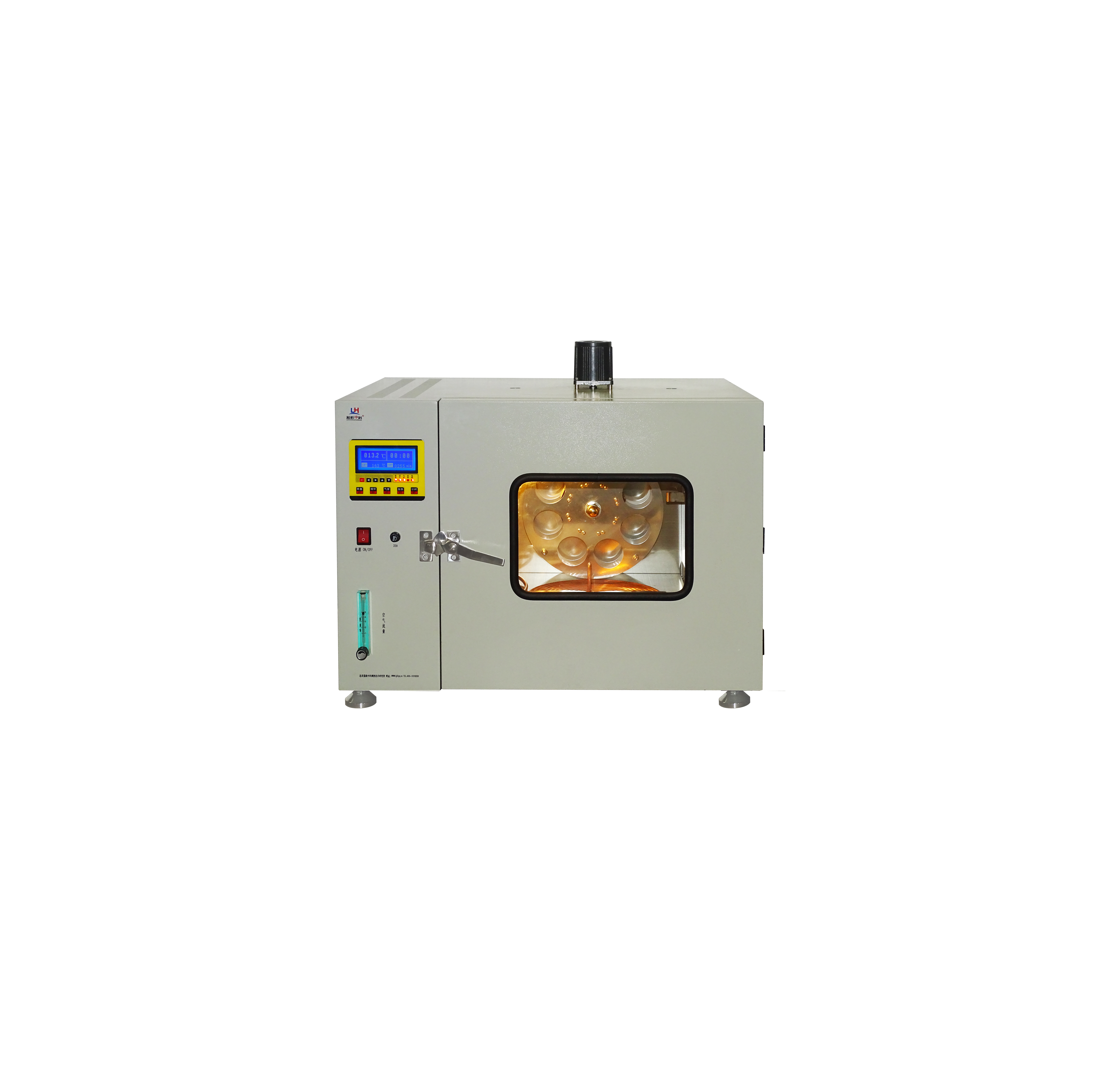 3、烘箱附带一台小型空气压缩机,供试验所需空气,空气通过面板上流量计计量后进入烘箱内盘旋的铜管内预热,然后有喷嘴喷入转盘上的试样瓶中,烘箱内空气流在强制通风道及鼠笼式风扇的作用下,按一定的方向回转流通,部分多余气体由上部溢流口排出烘箱外。